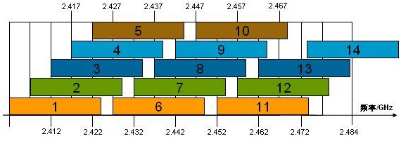 為了最大程度的利用頻段資源,可使用1、6、11;2、7、12;3、8,13;4、9、14這四組互相不干擾的信道來進(jìn)行無線覆蓋。