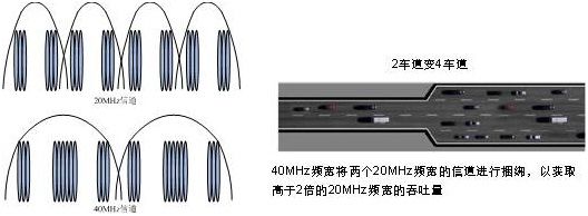 802.11n同時定義了2.4GHz頻段和5GHz頻段信道,沿用了802.11g和802.11a的頻譜資源,分別稱之為802.11gn模式和802.11an模式。但與802.11a/g每信道只用20MHz頻寬不同的是,11n定義了兩種頻帶寬度: 20MHz頻寬和40MHz頻寬。