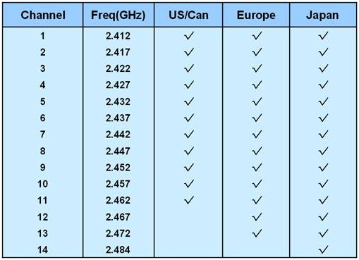下面的表1列出了802.11g在各國家授權(quán)使用的頻段。在北美地區(qū)(美國、加拿大)開放1-11信道,在歐洲開放1-13信道。中國與歐洲一樣,同樣開放1-13信道。