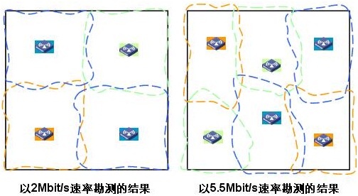 無線用戶所選擇的速率將極大地影響單AP并發(fā)用戶數(shù)量與覆蓋范圍,從而影響網(wǎng)絡(luò)勘測的結(jié)果。例如圖4所示,以兩種不同的速率勘測同一開放式辦公區(qū)域。如果在2Mbit/s的速率下需要4個AP覆蓋用戶區(qū),而如果在5.5Mbit/s的速率下,則需要6個AP才能覆蓋。因此,充分了解用戶業(yè)務(wù)對帶寬的需求是非常重要的。