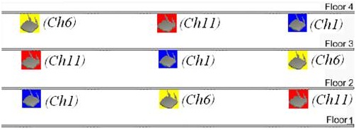 在多樓層無線覆蓋時,信道的設(shè)置要考慮三維空間的信號干擾。如圖3所示,在1樓部署3個AP,從左到右的信道分別是1/6/11,此時在2樓部署的3個AP的信道就應(yīng)該劃分為11/1/6,同理3樓為6/11/1。這樣就可最大程度地避免了樓層間的干擾,無論是水平方向還是垂直方向都按照無線蜂窩式覆蓋原則進(jìn)行部署。