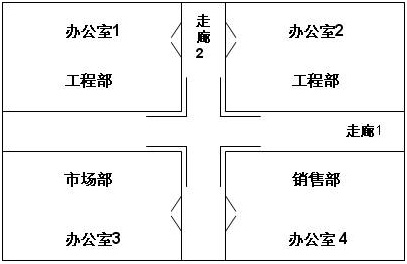 1、兩個十字交叉的走廊分四個辦公室,將三個不同部門分割開。