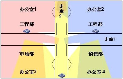 在市場部和和銷售部之間的AP放置在兩辦公室的門口處,這樣1臺AP可覆蓋兩間辦公室的區(qū)域,移動辦公的無線用戶不會再出現(xiàn)跨小區(qū)域切換的情況。